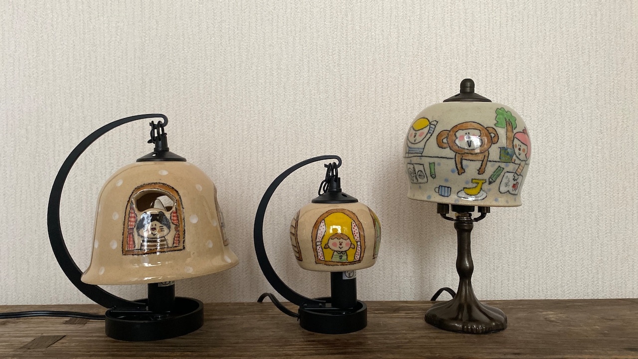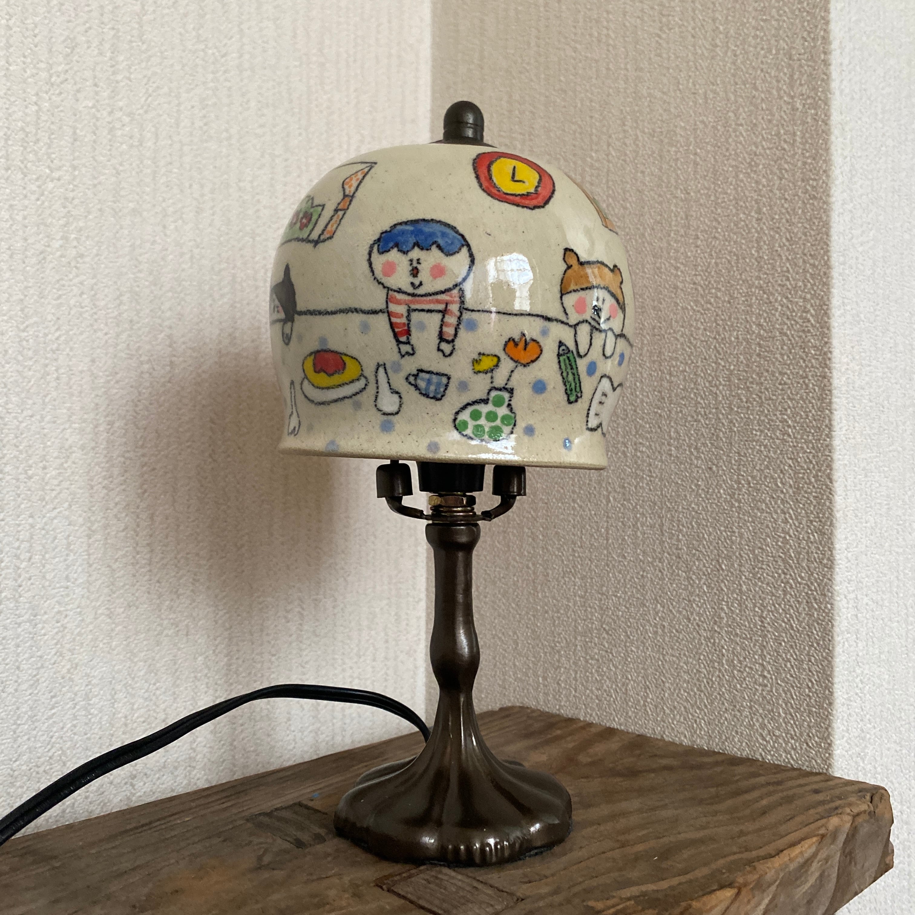 心地よい空間を演出する「テーブルライト❶」です!陶芸作家こさえるが手掛けたこの魅力的な陶器製ランプシェードは、ご覧のようにほんのりとした明るさで可愛らしく優しい雰囲気をもたらし、心を和ませること間違いなしです。